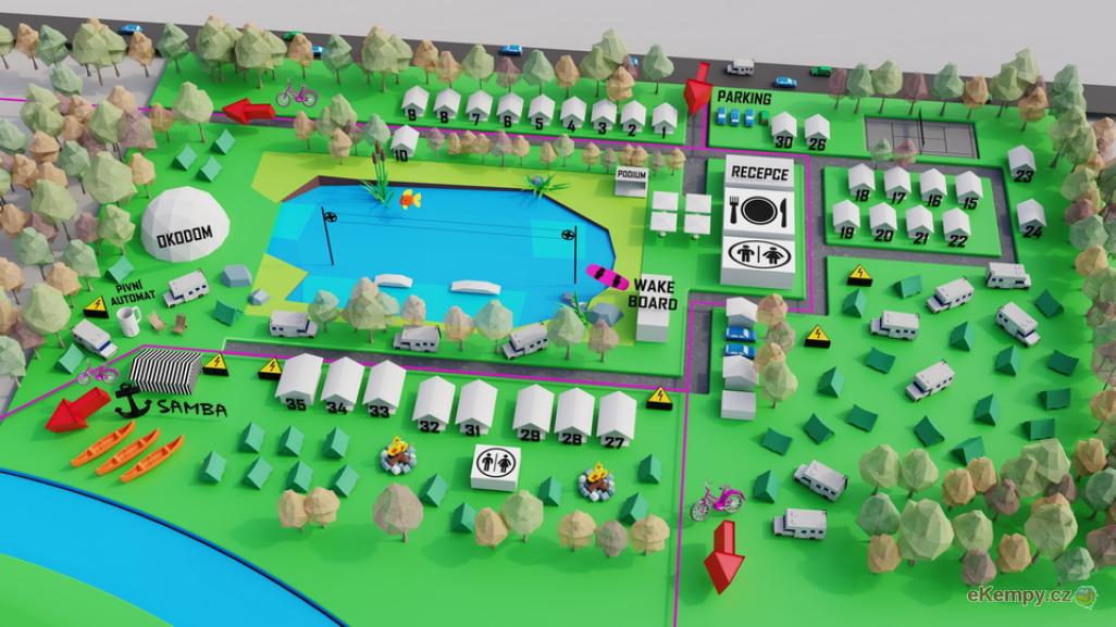 Der Campingplatz bietet einen Samba-Bootsverleih und einen Wakeboardpark. Für weitere Sportaktivitäten stehen ein Beachvolleyballfeld, ein Mehrzweckspielplatz und ein Kinderspielplatz zur Verfügung. Im Restaurant werden tschechische und internationale Küche serviert.