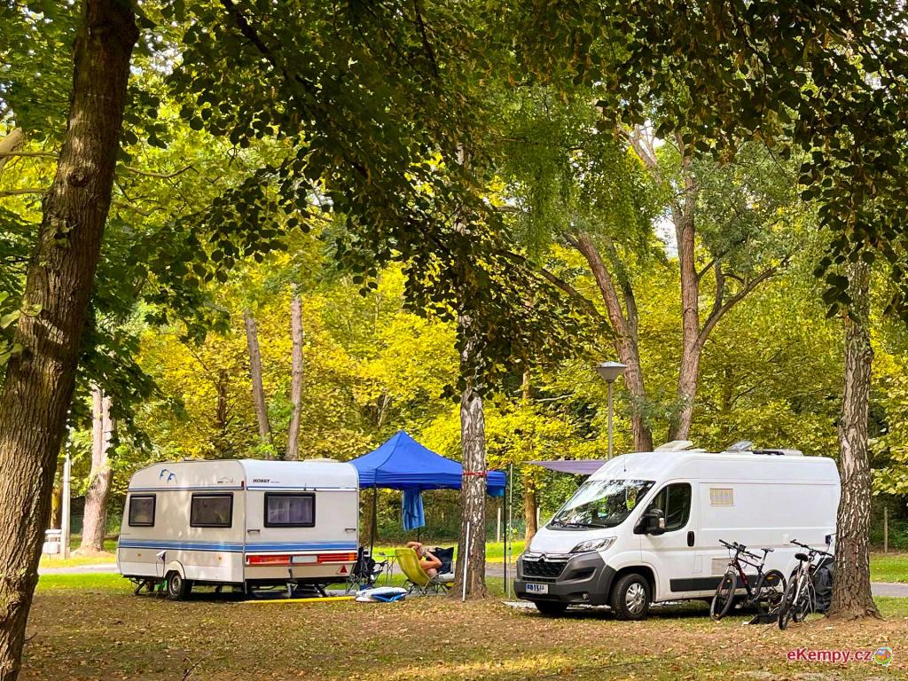 Kempová místa pro karavany a stany mají rozlohu 100m2 a nachází se na udržovaných plochách mezi stromy, k dispozici jsou el.přípojky 10A a odpad, místo je vhodné až pro 8osob a parkování jednoho automobilu, Wifi je k dispozici u recepce. Kemp je otevřen 18.4. - 5.10.