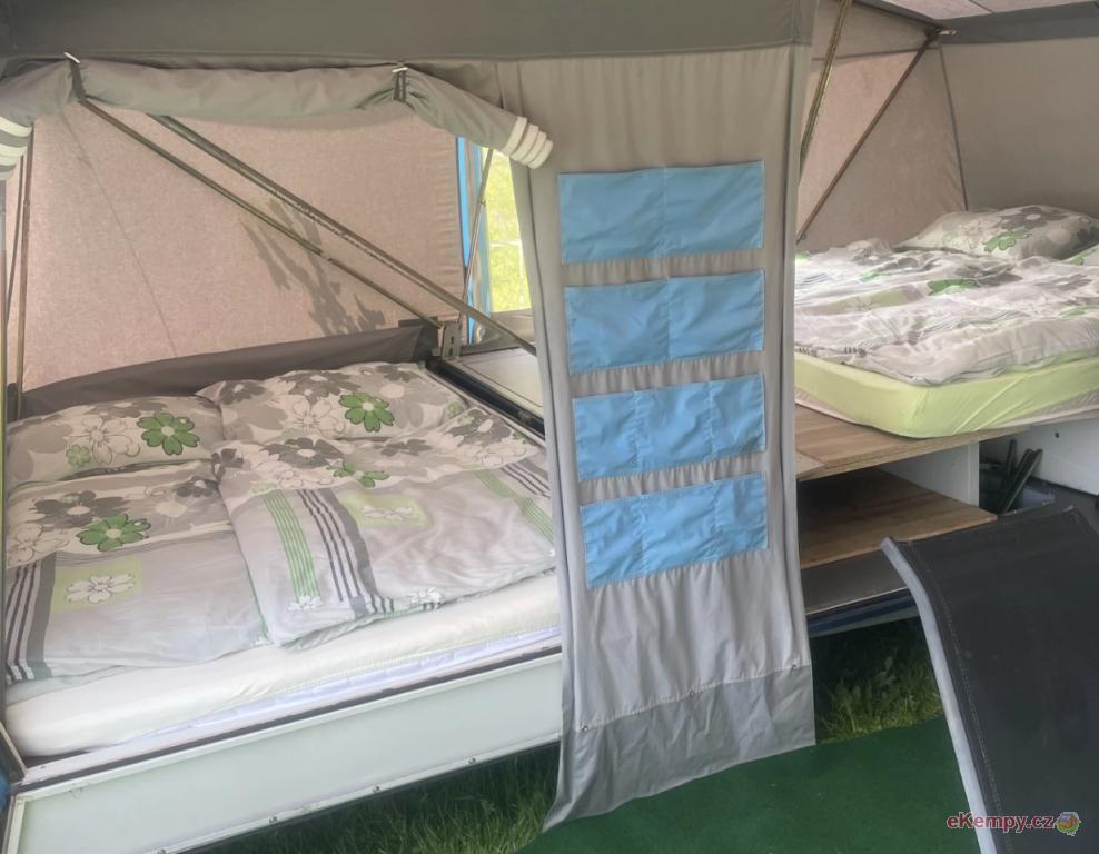 🚐 Wohnwagenunterkunft: zwei Standardbetten und ein breiteres Bett (110 cm), Kühlschrank, Kleiderschrank, Sitzgelegenheiten vor dem Wohnwagen