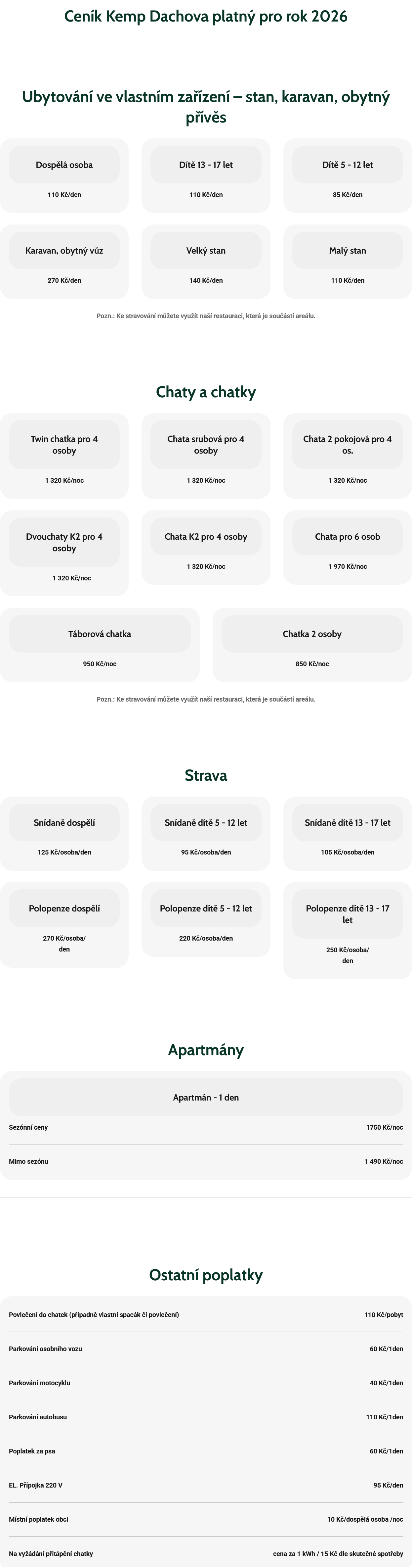 Camping befindet sich im malerischen Ambiente des Gebietes unter Riesengebirge. Ganzes Areal ist von Wäldern umgeben und Unterkunft ist in 4-Bettsommerhäuschen, in einem Gebäude, in Zelten und Caravanen möglich. Lokalität, in der sich Camping befindet, ist eine der ökologisch saubersten Lokalitäten Tschechiens.