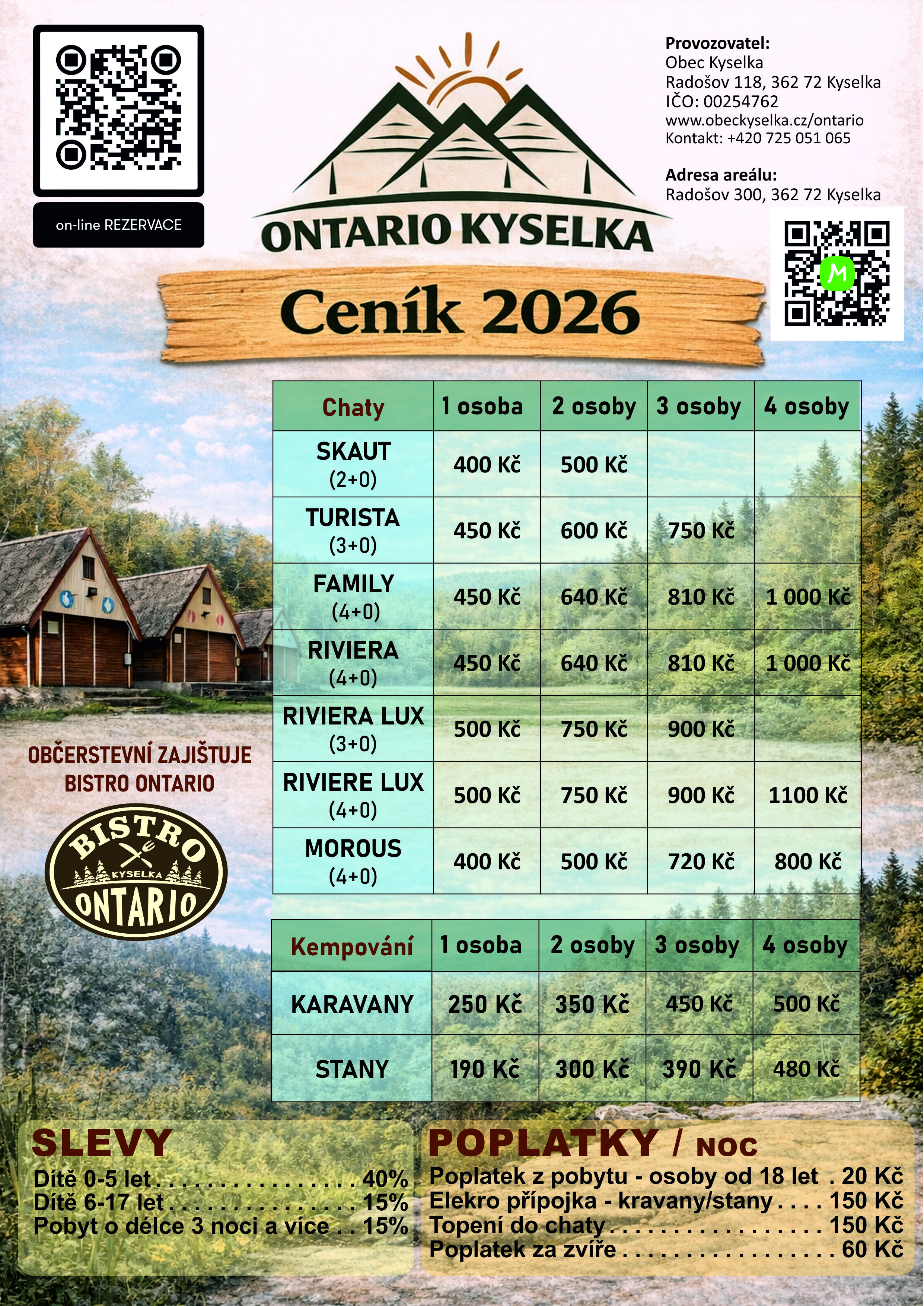 „Das Freizeit- und Erholungsareal Ontario befindet sich nach vielen Jahren wieder in der Verwaltung der Gemeinde Kyselka und wird seit 2021 schrittweise renoviert. Es ist ein ruhiger und einzigartiger Ort, eingebettet in eine schöne Natur. Neben dem klassischen Camping und der Unterkunft in Hütten wird das Areal für Sommer-Kinderlager, Firmen- und Vereinsveranstaltungen, Hochzeiten, Konzerte sowie weitere gesellschaftliche und kulturelle Veranstaltungen genutzt.”