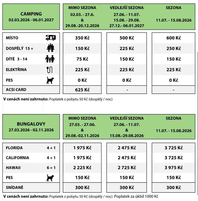 Camping liegt im östlichen Teil Prags - Dolní Počernice, in ruhiger, romantischer Natur. Die Dienstleistungen werden hier auf dem Niveau Europas gewährt. Unterkunft wird in Bungalows, Mobilhäusern, in luxuriösen Appartements, in Zelten oder Wohnwagen angeboten.