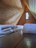 Wir bieten Unterkunft in 4- und 5-Bett-Hütten und Plätze für Zelte und Wohnwagen mit Stromanschluss.