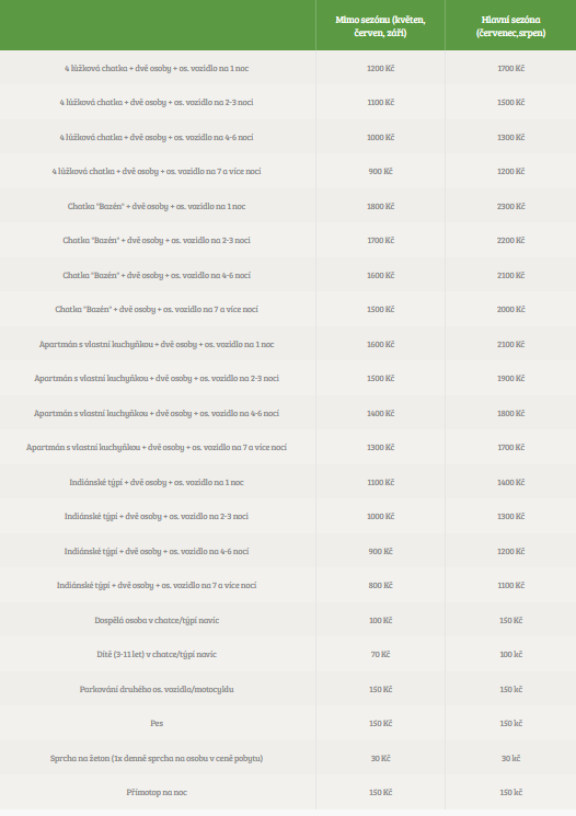 Ubytování ve čtyřmístných chatkách s 2 lůžky v přízemí a 2 místy v podkroví. Každá chatka má svou terasu. Wi-Fi zahrnuta v ceně chatek. Dále nabízíme ubytování v indiánském týpí, apartmánu, vlastním stanu, karavanu, či obytném automobilu.