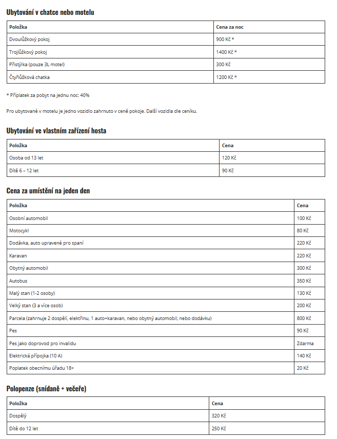 Der Campingplatz liegt im Flusstal Staříč zwischen der Ortschaft Lipová Lázně und der Stadt Jeseník im Erholungsgebiet Bobrovník. Seine sehr ruhige Gegend ist von dem naheliegenden Naturschutzgebiet beeinflusst. Der Campingplatz bietet ganzjährige Unterkunft im 4-Betthütten mit gemeinsamer sozialer Einrichtung und im Motel in Zwei - und Drei-bettzimmern auch mit eigener sozialer Einrichtung an. Parken ist bei der Wohneinheit möglich.