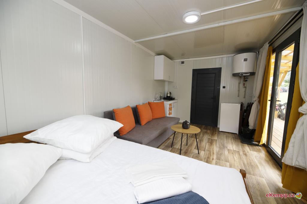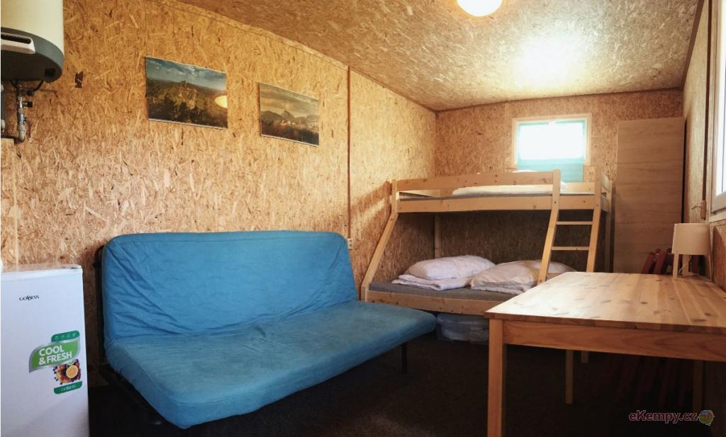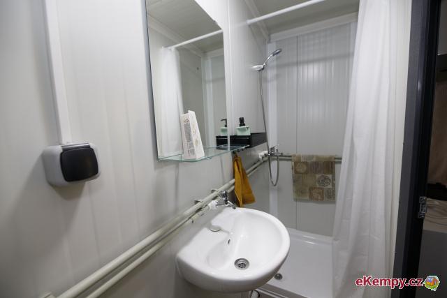 Das Camp Děčín - Zelte, Wohnzelte, Caravane, Radaufbewahrung für Öffentlichkeit, Kinderspielplatz, Toiletten, Duschen, Wifi und Informationszentrum.